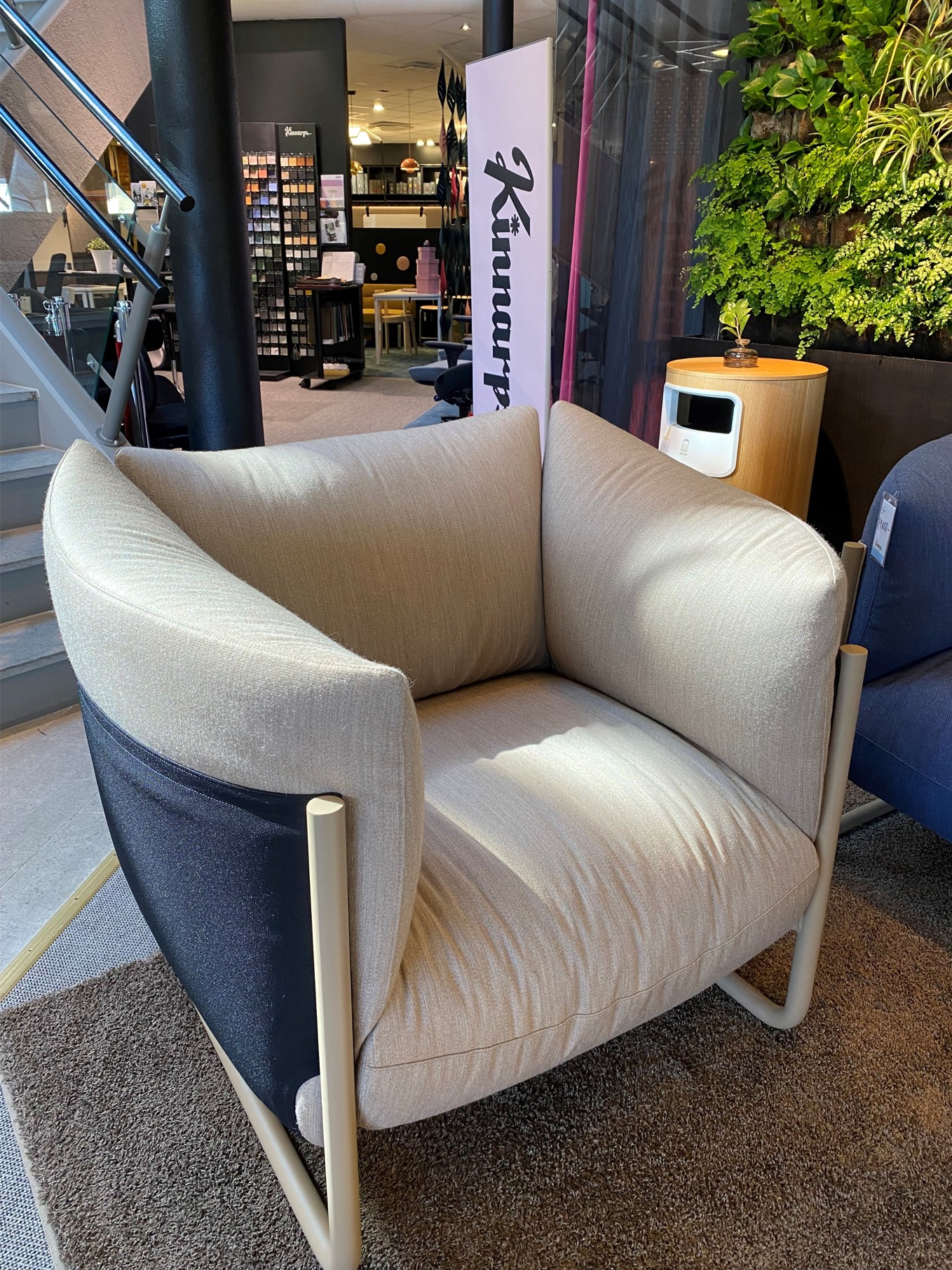 Fåtölj Rho från Materia med beigelackat stativ och beige avtagbar klädsel.