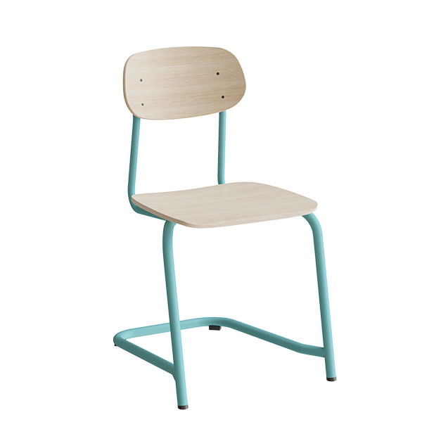 Stol Atlas från Sono i modell 2116.62 Frisving vuxen, höjd 62cm, stativ i turkos lack, sits och rygg i ljus eklaminat. Modell avsedd för äldre barn.