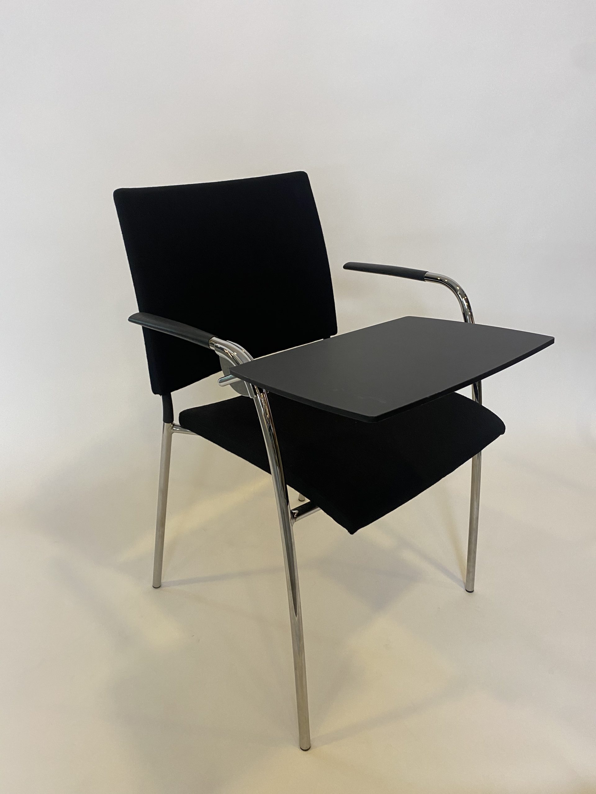 Karmstol Spira från Lammhults med laptopskiva. Kromstativ och klädd sits och rygg.
