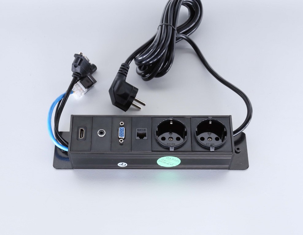 Power Inlay för bl.a Bi-box från Götessons, bestyckad med 2 eluttag,1 nät, 1 VGA, 1 Ljud och 1 HDMI, produkten är i svart.